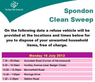 The Spondon Clean Up day on July 16th saw a Council refuse lorry and metal collection lorry calling at five locations in Spondon. The event was a real success with 2.5 tonnes of unwanted large bulky waste being collected and over 150kg of metal.